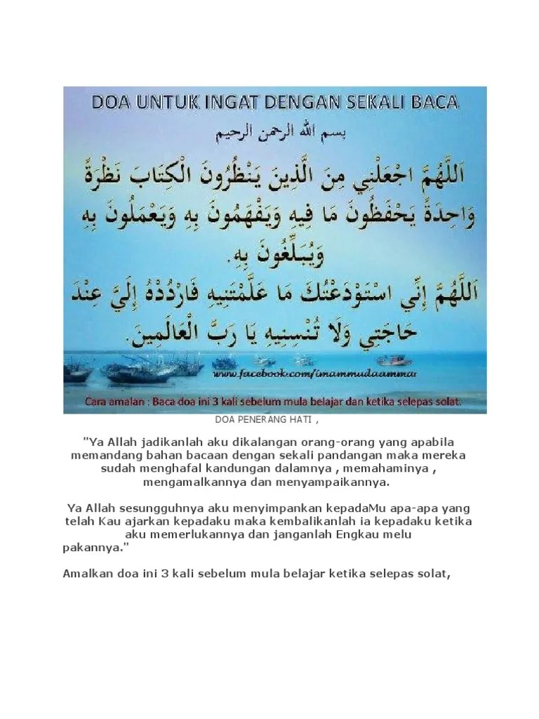 Menuntut ilmu itu wajib bagi semua orang islam seperti sabda rasulullah di dalam satu hadis riwayat ibnu majah. Baik golongan muda ataupun tua, doa ini menunjukkan usaha kita untuk . Ada doa yang mudah diingati . Doa belajar, doa penerang hati dan doa mudah belajar adalah salah satu usaha untuk mendapat rahmat dan pertolongan allah swt dalam . Doa menghadapi peperiksaan dan doa penerang hati. Amalan doa penerang hati elok dilakukan oleh setiap lapisan masyarakat.